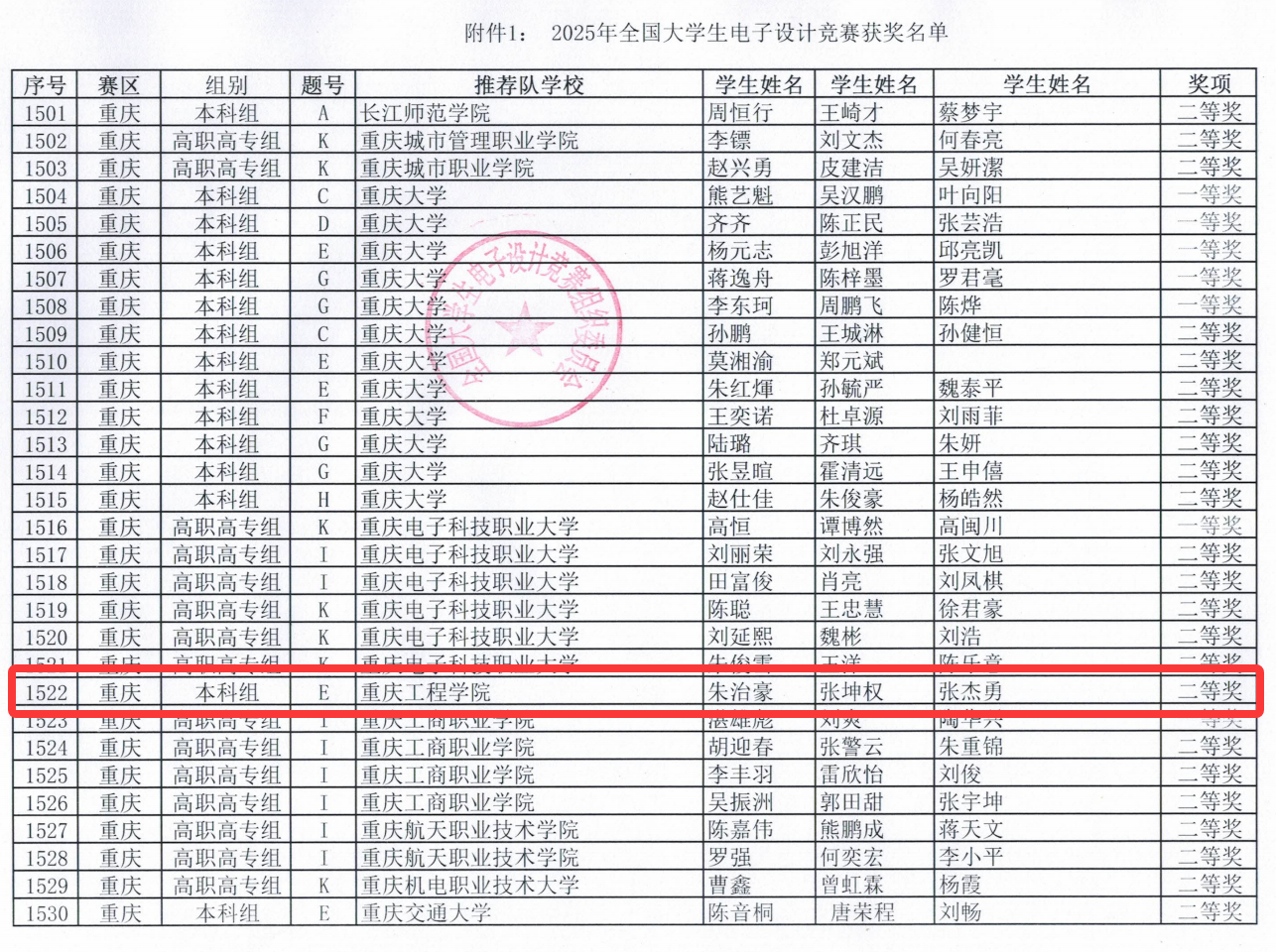 近日,2025年全国大学生电子设计竞赛获奖名单正式公布。重庆工程学院电子信息学院朱治豪、张坤权和张杰勇三位同学凭借扎实的专业功底、出色的实践能力与高效的团队协作,历经多轮激烈比拼,最终荣获全国二等奖。