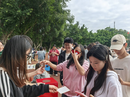 本次活动以“心理减压+趣味互动”为核心,设置多项沉浸式体验环节:首先开启趣味挑战区体验,恐怖箱的未知刺激让参与者既紧张又兴奋,投壶的传统韵味唤起竞技热情,彩绘区的创意表达则成为情绪释放的“画布”;完成游戏后,师生可凭累积积分兑换套圈赢取零食、饮料,或参与抽奖抽取惊喜礼品,现场笑声与欢呼声交织,轻松氛围弥漫全场。