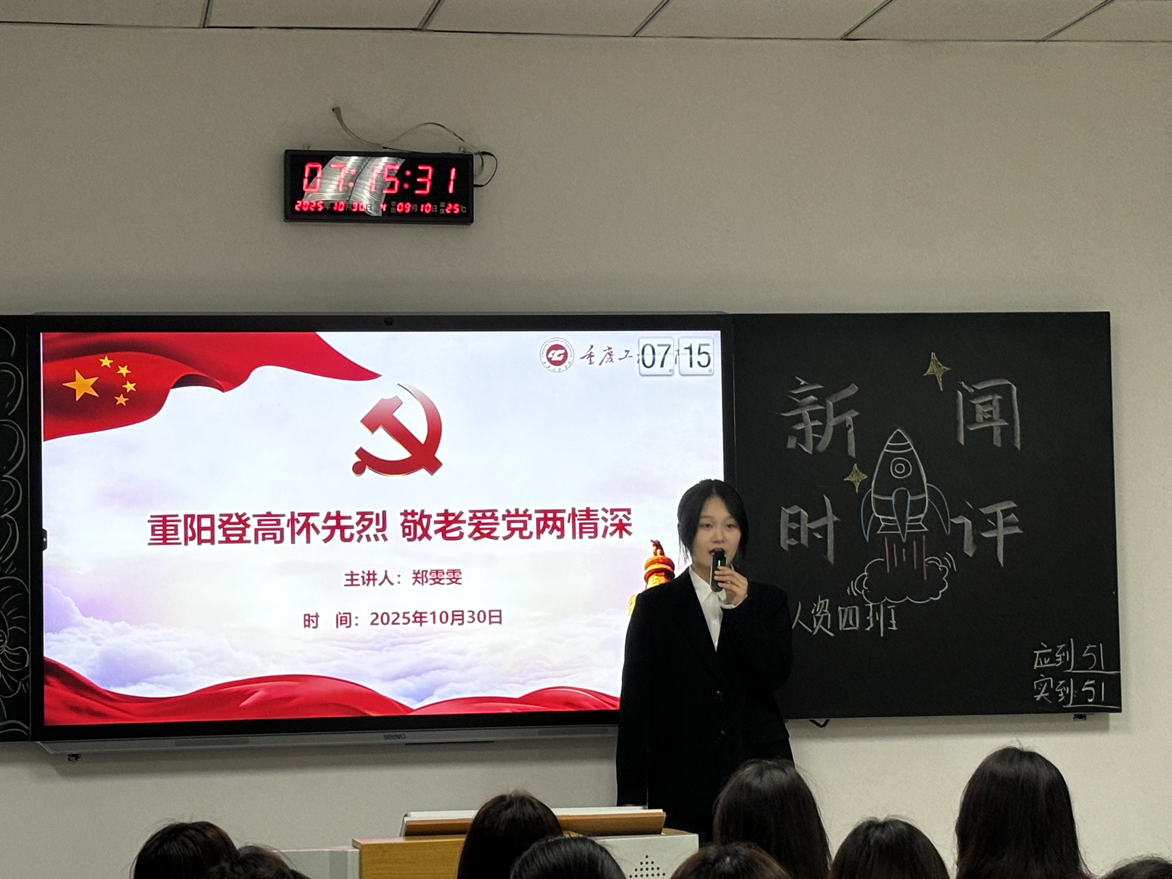 本次微党课将重阳文化内涵与红色精神传承深度融合,以“登高”“敬老”两大核心载体串联起整场活动。宣讲中,学生党员们结合史料故事与现实案例,从重阳“登高望远”的习俗引申至革命先辈“勇攀高峰、不畏艰险”的奋斗历程,让同学们在节日语境中深刻感悟革命精神的时代价值;同时,围绕“敬老”传统,诠释了“敬老”不仅是中华民族的传统美德,更是对老一辈共产党员精神风范的传承与致敬。