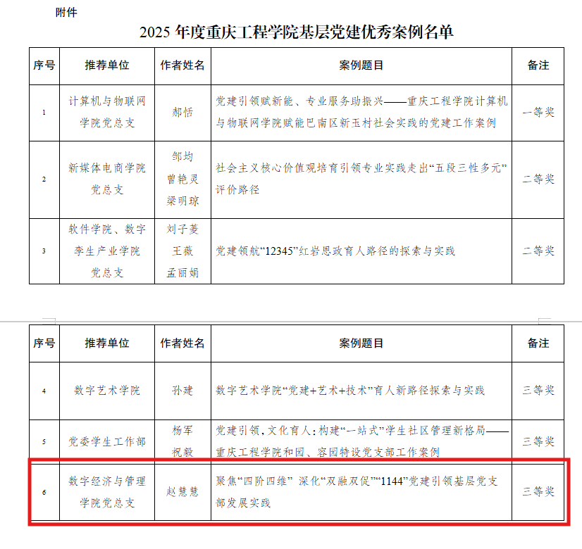 本网讯(文/图 焦淑东 学生党教中心)我院营销人资党支部书记赵慧慧在“重庆工程学院2025年度基层党建优秀案例”评选中,报送的案例《聚焦“四阶四维” 深化“双融双促”“1144”党建引领基层党支部发展实践》获评三等奖。