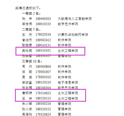 本网讯(文/图 刘益明)为进一步提高当代大学生的网络安全意识,更好的促进学校网络安全教育的发展,重庆工程学院于9月举办了网络安全知识竞。土木学院学生吴玲英与唐熙婷、王祥分别荣获二、三等奖。