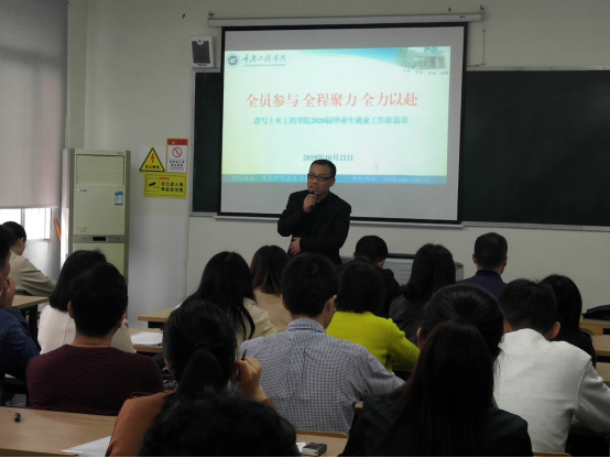 就业科长元云丽首先对2019届毕业生就业工作做总结;随后党总支书记李龙宣读了“土木工程学院关于成立2020届毕业生就业创业工作小组的通知”,对2020届毕业生就业提出工作要求,并要求全体教职工做到“全员参与、全程聚力、全力以赴”。