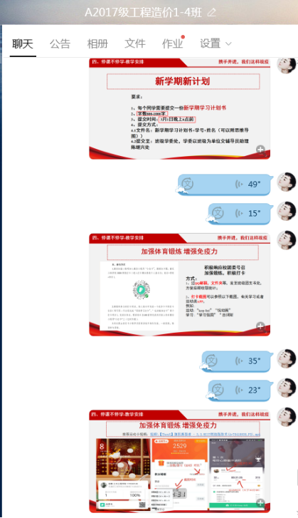 本网讯(文/图 魏鑫)光阴似箭,因为疫情的发展还未得到全面的控制与消除,我校寒假已经放了将近一个半月了。为了让同学们在家中也能感受到学校的气氛,跟上学习的进度,土木工程学院辅导员易倩文老师于2020年2月23日19:00在17级工造1-4班QQ大群开展了“携手并进,我们应该这样战疫”线上主题班会。17级工程造价专业1-4班全体学生参与。
