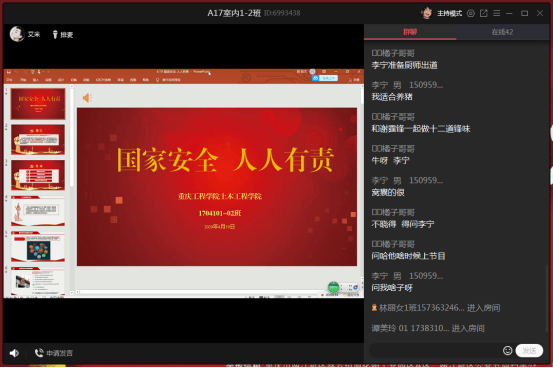 本网讯 (文/图 曾燕)为增强学生们的国家安全意识和风险防范意识,2020年4月19日晚 8:00-9:00,17级室内艺术设计专业召开了一场主题为“国家安全,人人有责”的云班会。