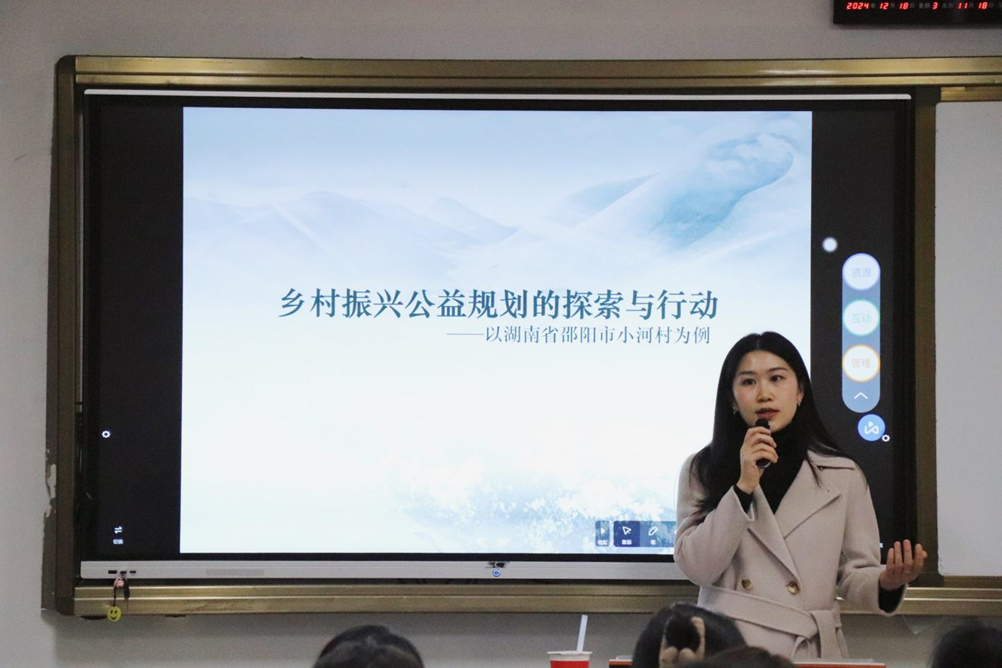 龚老师以“乡村振兴公益规划的探索与行动”为主题,深入浅出地讲述了以邵阳市小河村项目为例的乡村振兴规划过程。讲座过程中,龚老师为同学们深入剖析了乡村振兴全过程,包括前期规划思路与内容制定,以及后期服务举措与成果展示。她指出乡村振兴并非简单的经济开发,而是要从产业发展策略入手,全面考虑生态、文化、社会等多元因素,实现可持续发展,让同学们明晰其理论内涵与实践要求。最后龚老师鼓励同学们要深入了解“乡村振兴公益规划的探索与行动”理念,将理论与实践相结合,并再次强调,在乡村振兴发展过程中,同学们应利用好自己的专业知识,为乡村发展谋福祉,为祖国美丽乡村建设添砖加瓦。
