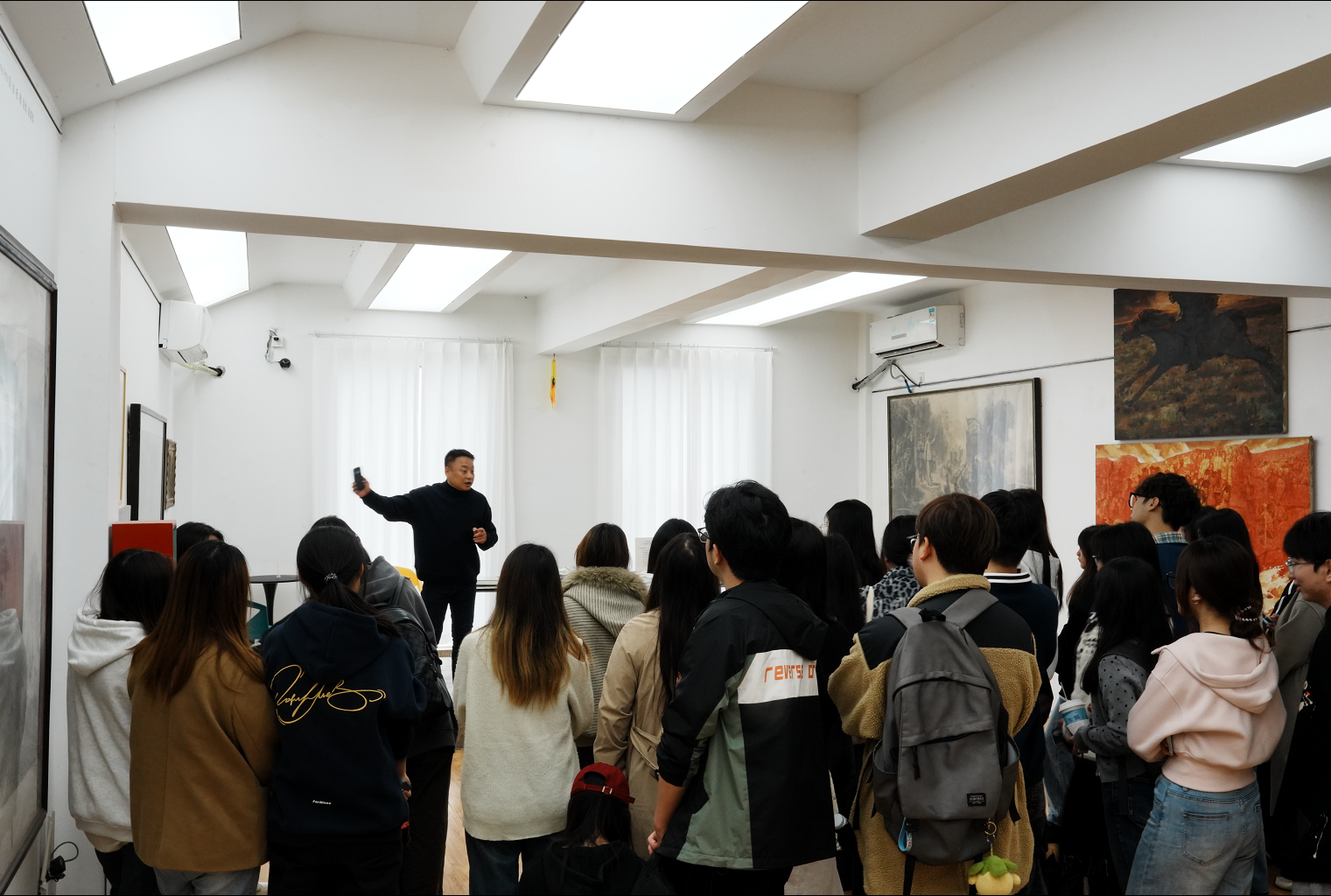 在绘画作品(馆藏)展区,美术馆馆长罗群毅亲自为师生们进行讲解。他结合馆藏作品的创作背景、艺术风格及技法特点,进行了细致入微的解读。从传统绘画的笔墨韵味到当代绘画的创新表达,罗馆长的讲解深入浅出,让师生们对不同时期、不同流派的绘画作品有了更深刻的认识,也感受到了艺术创作中蕴含的文化底蕴与人文精神。
