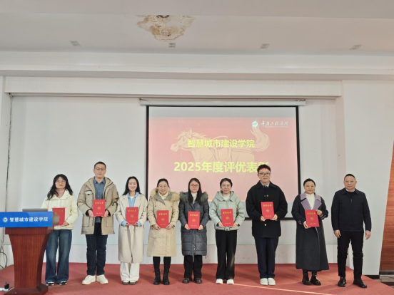 在总结表彰环节,院长雷江首先宣读了学院关于表彰优秀个人的决定,并邀请谭明术副校长为受表彰个人颁发证书,随后2名优秀代表依次发言。接着,雷江对学院2025年工作展开总结,重点回顾了教学、科研、师资队伍建设、校企合作协同育人、学生教育、招生就业、党建品牌、宣传等方面的工作,既肯定了成绩,也指出了不足,尤其围绕存在的问题深入剖析原因、明确改进方向,并着重强调了2026年的工作要点。