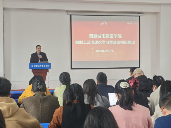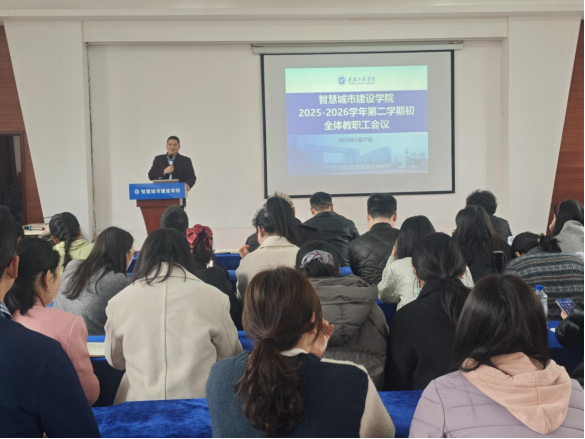 本网讯(文/图 吴俊峰) 2月27日,智慧城市建设学院在学院三楼多功能厅召开了2025-2026学年第二学期期初教职工大会,会议由唐和平书记主持,全体教职工参加。