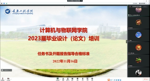 本网讯(文/图 熊文超为了落实《重庆工程学院教务处关于做好2023届本科毕业设计(论文)相关工作的通知》(教函〔2022〕96号)文件要求,我院严格依照《重庆工程学院本科毕业设计(论文)管理办法(修订)》(渝工程院教〔2020〕67号)和专业人才培养方案要求,召开2023届毕业设计(论文)培训会议。会议重点为任务书及开题报告指导合格标准培训。会议由教务科长秦旗主持,李发陵院长主讲,全体毕业设计指导教师参加。