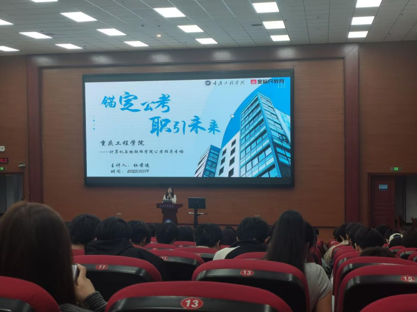 (本网讯 文图/魏克非)202510191830分,我院邀请了来自金标尺教育的杜前进老师在南泉校区七教807学术报告厅成功举办了重庆工程学院计算机与物联网学院公考指导专场,2023级计算机学院全体学生参加,金标尺教育主讲人杜前进老师,为在场学子带来一场干货满满的公职类职业发展与备考重点的盛宴,现场气氛热烈。