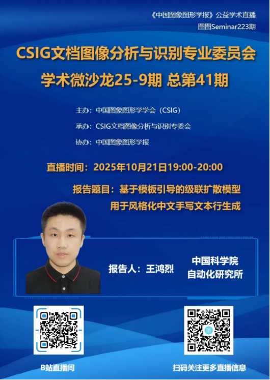 本次报告由中国科学院大学自动化研究所硕士研究生王鸿烈主讲,报告主题为《Template-Guided Cascaded Diffusion for Stylized Handwritten Chinese Text-Line Generation》。报告由中科院自动化所副研究员张燕明主持。