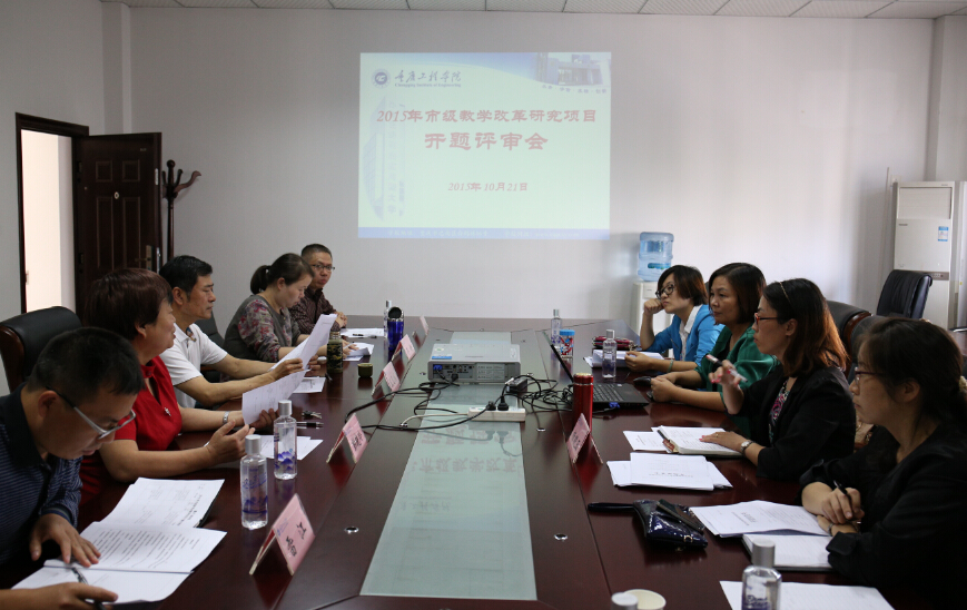 本网讯(教务处  杨晓玉)2015年10月21日下午14:00在学校行政楼第三会议室,教务处组织了2015年市级教学改革研究项目开题评审会。会议邀请了彭晓玲教授、王玉柱教授和李静、雷江、周龙福三位副教授作为评审专家,我校获批的《新建本科院校职业化、企业化、实体化校内实训基地建设研究—以重庆工程学院为例》等五个市级教改项目负责人及部分主研人员参加了会议。