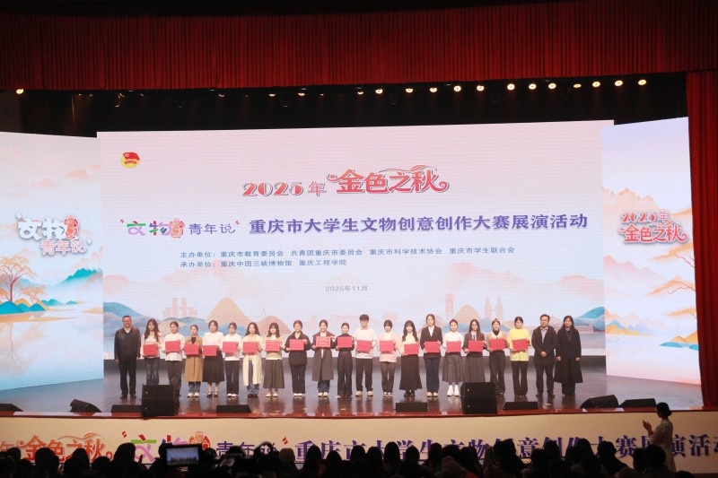 本网讯(文/党委宣传部 图/大学生记者团)11月28日下午,2025年“金色之秋”“文物青年说”重庆市大学生文物创意创作大赛展演暨颁奖典礼在我校举行。伴随开场舞蹈《博物馆之夜》的灵动舞姿,来自全市48所高校的师生代表齐聚一堂,共同见证青年创意与巴渝文物碰撞出的文化火花。