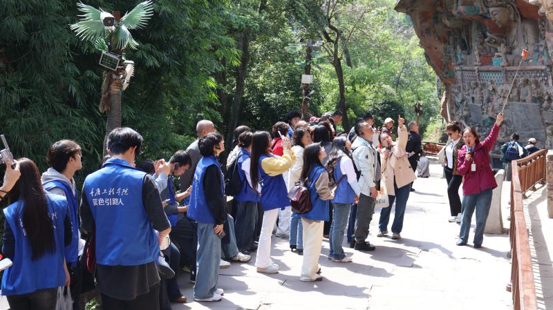 下午,同学们前往世界文化遗产—大足石刻,开启深度文化研学之旅。大足石刻以精湛的雕刻技艺、丰富的题材内容闻名于世,是中国晚期石窟艺术的杰出代表。在专业讲解员的带领下,大家依次参观核心造像区域,聆听雕像背后的历史故事、人文内涵与艺术特色。古代工匠的智慧与匠心令同学们赞叹不已,大家驻足观赏、认真记录、积极交流,深刻体会到中华传统文化的博大精深。