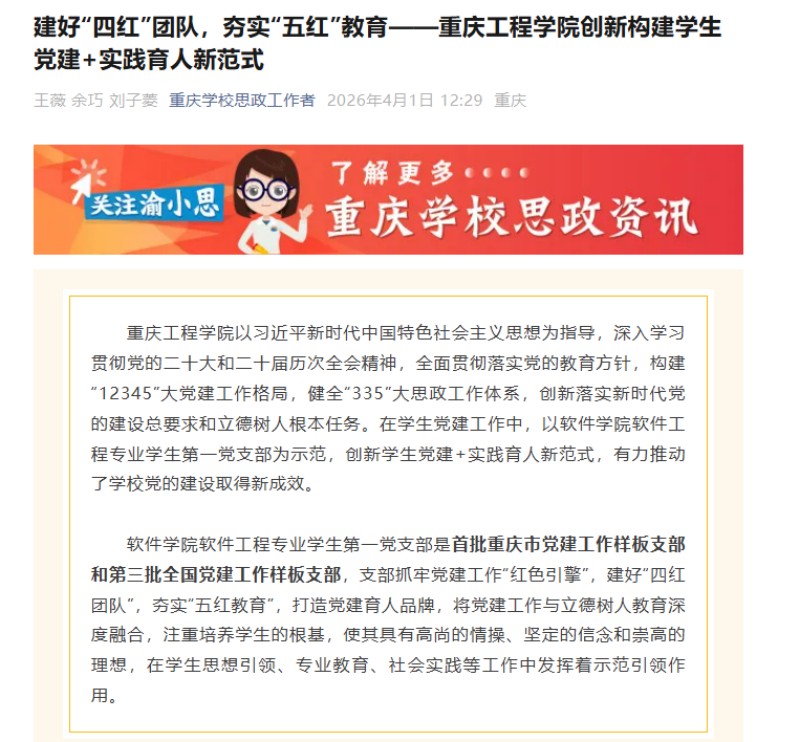 本网讯(文/图 软件学院 孟丽娟)4月1日,重庆市教委官方微信公众号“重庆学校思政工作者”,对我校软件学院党建与实践育人融合创新工作进行了专题报道。