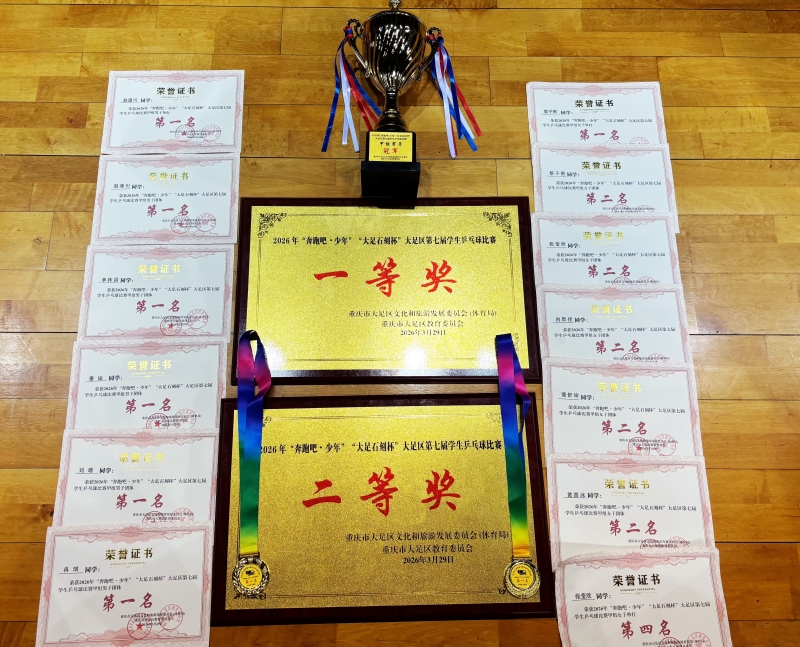 本网讯(文/图 基础学院 文雄)3月27日至29日,2026年“奔跑吧·少年”“大足石刻杯”大足区第七届学生乒乓球比赛在大足区体育中心篮球馆举行。我校乒乓球队在此次赛事中表现优异,一举夺得甲组男子单打第一名、甲组女子单打第一名、甲组男子团体第一名、甲组女子团体第二名等多项荣誉,并以绝对优势荣获甲组(大学高中组)团体总分第一名,为本校参加该项赛事以来的历史最好成绩。