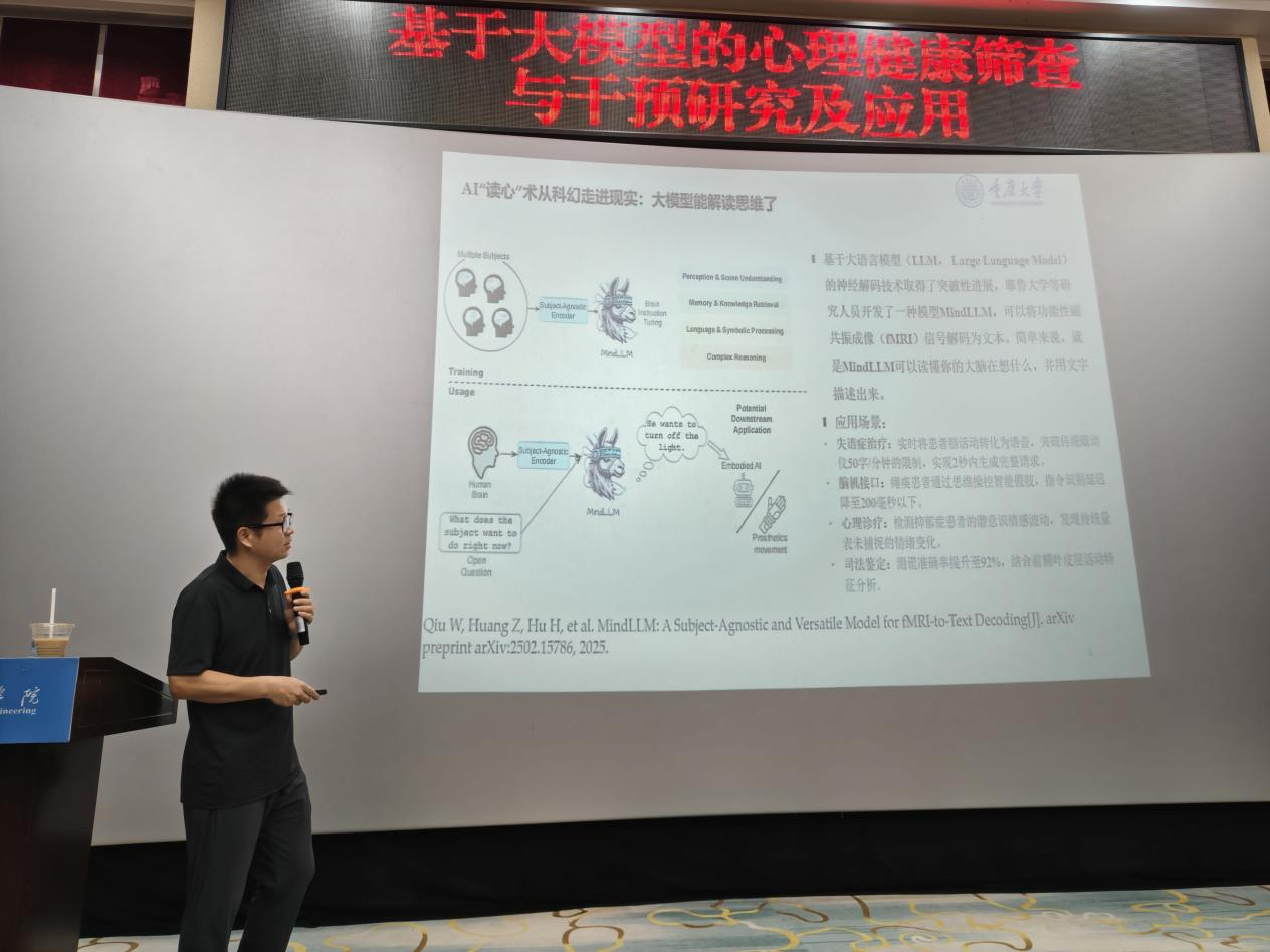本网讯(文/图 大数据技术与应用研究所 马凯)为帮助师生深入了解大模型技术的前沿应用,大数据技术与应用研究所于9月24日下午在办公楼报告厅成功举办专题讲座,特邀重庆大学计算机学院邹东升副教授担任主讲。邹教授以“基于大模型的心理健康筛查与干预研究及应用”为题,系统介绍了大语言模型在心理健康领域的创新研究与实际应用进展。讲座由研究所所长何宏靖主持,大数据与人工智能学院副院长吴平及学院师生共计百余人参加。