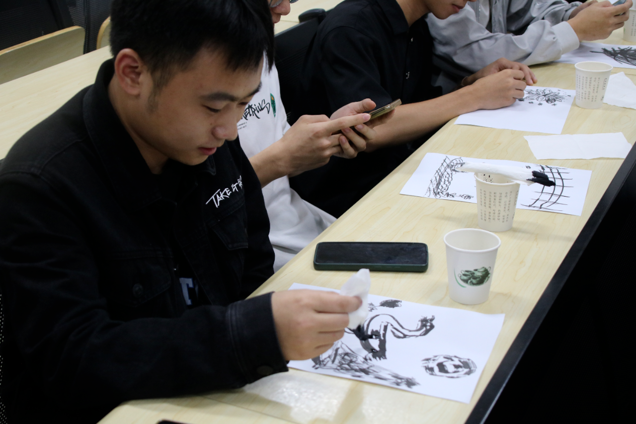 活动分为四个环节。首先通过播放青绿画与水墨画的对比视频,生动展示了两者在用色、技法和审美意境上的鲜明差异;随后进行的专业讲解系统梳理了中国画从唐代青绿山水到宋元水墨意趣的风格演变历程,深入解读了其背后的文化内涵与哲学思想;在实践体验环节,同学们亲手执笔绘制,在笔墨丹青间感受传统艺术的独特韵味;最后分组交流与作品分享将活动推向高潮,大家踊跃发言,畅谈创作心得与艺术感悟。