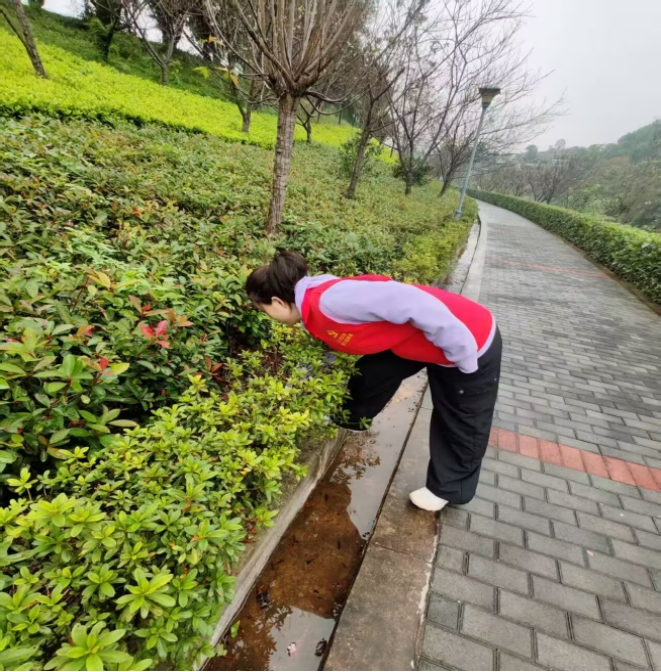 活动中,同学们身着红色志愿马甲,手持清洁工具,立即投入到河道清理工作中。大家分工协作,对河岸、草丛、石缝中的塑料瓶、包装袋、烟头等垃圾进行细致清理,以实际行动维护河道环境整洁。在劳动过程中,同学们相互配合,展现出团结协作的精神风貌。