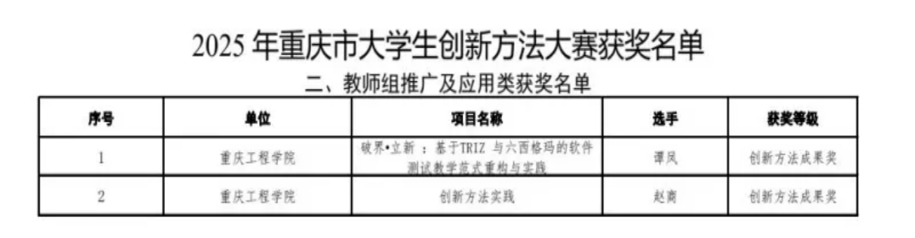 软件学院谭凤、赵商两位教师在2025年重庆市大学生创新方法大赛中获“创新方法成果奖”