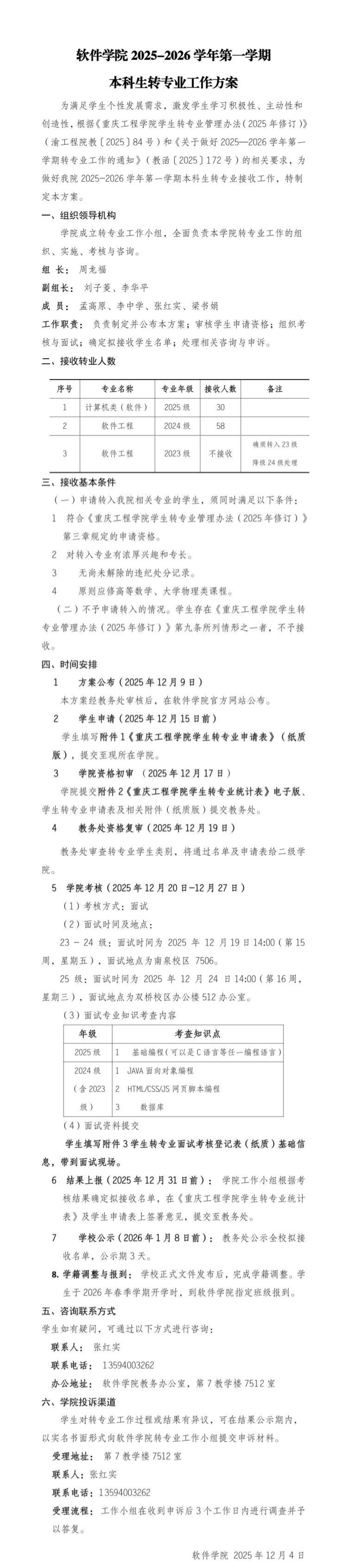 软件学院2025-2026学年第一学期本科生转专业工作方案