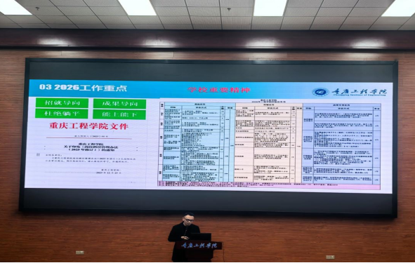 大会设集中会议与教研室分组讨论两个部分。当日上午,李华平副院长代表学院从2025年教学工作总结、存在问题剖析、2026工作重点三方面作年度教学工作总结。系统回顾了教学工作目标达成度、教学常规、毕业设计(论文)指导、教科研成果、教学竞赛及指导学生成效等情况,也客观分析了当前教学工作面临的问题,同时结合下步岗位聘任制推进,从审核评估工作启动、工程认证、专业建设、课程建设、教学改革、教师培养等维度对2026年重点工作进行阐述。