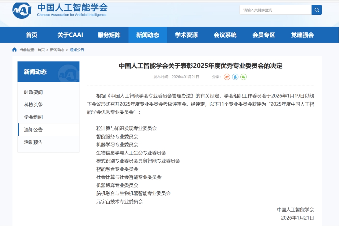 (文/图 软件学院 孟丽娟)据中国人工智能学会官网消息,我院张小川教授带领的机器博弈专业委员会获评为“2025年度中国人工智能学会优秀专业委员会”。