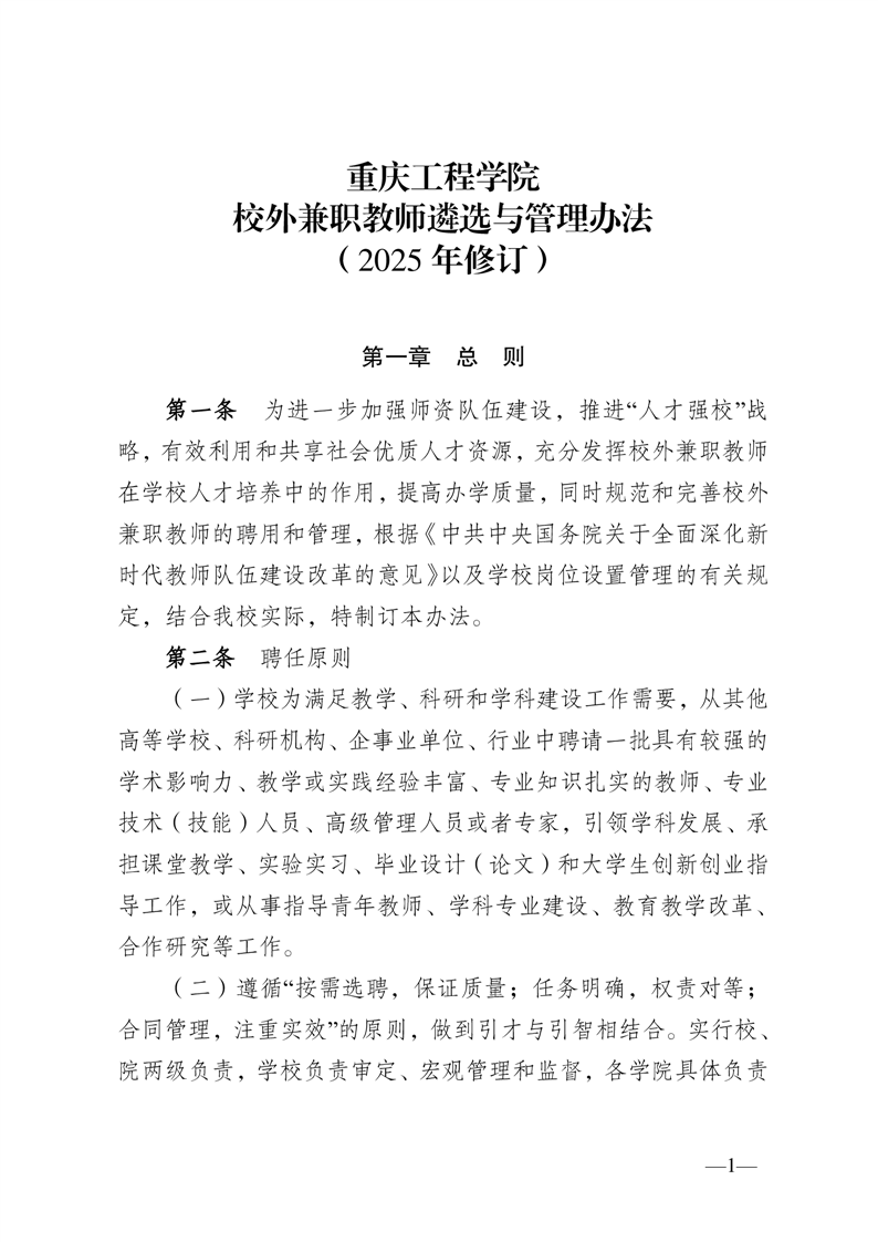 当前位置:首页 > 人事师资 > 重庆工程学院校外兼职教师遴选与管理办法(2025年修订)