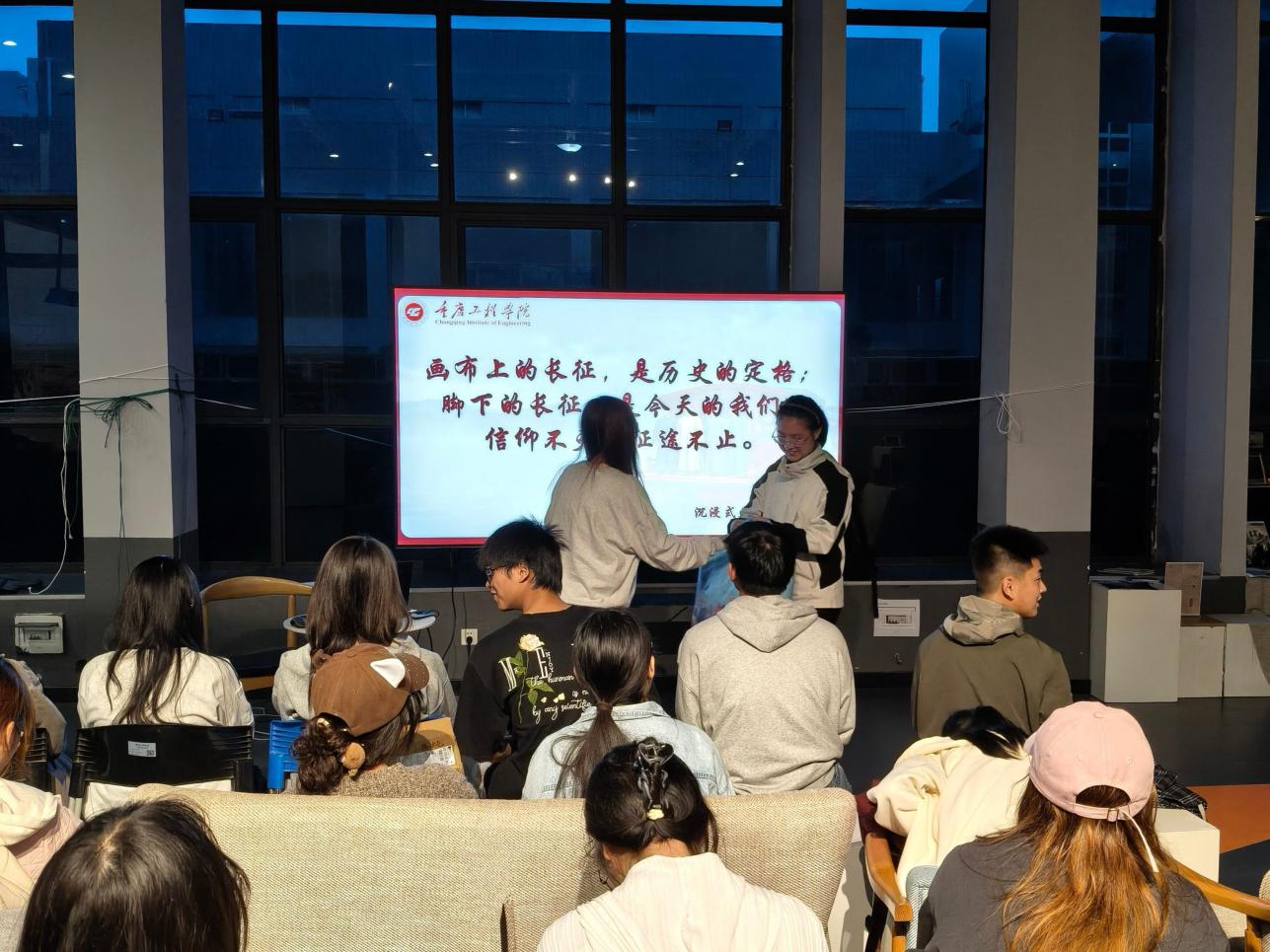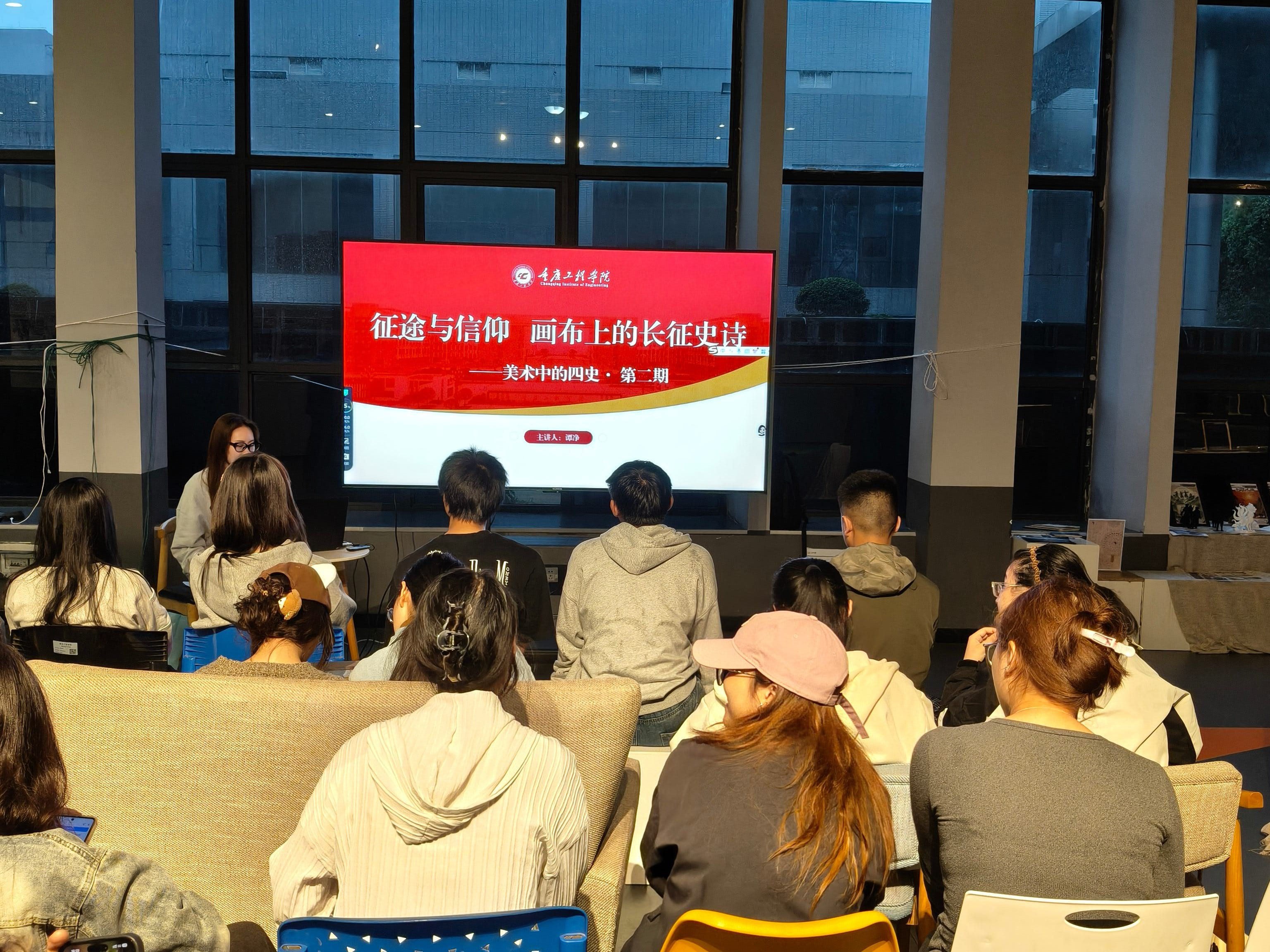 讲座中,主讲人谭净围绕长征主题,以经典美术作品为载体,从“溯源・绝境中的抉择”、“解码・美术如何刻画征途与信仰”、“叩问・新时代,我们如何续写长征?” 三个维度展开分享。她带领学生赏析《红军不怕远征难》《飞夺泸定桥》等美术经典画作,深入解读作品中蕴含的坚韧意志与革命信仰,并引导学生思考新时代背景下的“长征”内涵,鼓励大家将个人理想融入国家发展。
